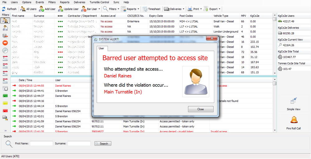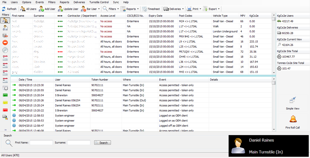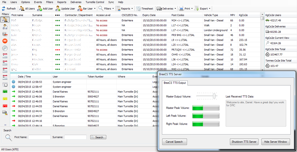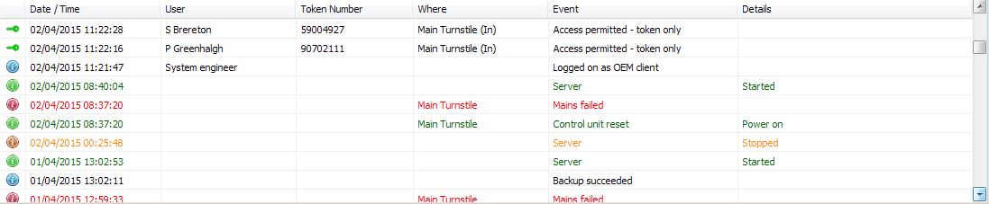 BreeCS has the ability to poll the Net2 server for system events in real time. The events list will contain information on user activity such as access granted or denied, information along with highlighting of barred users and general system information about the access control system as a whole.