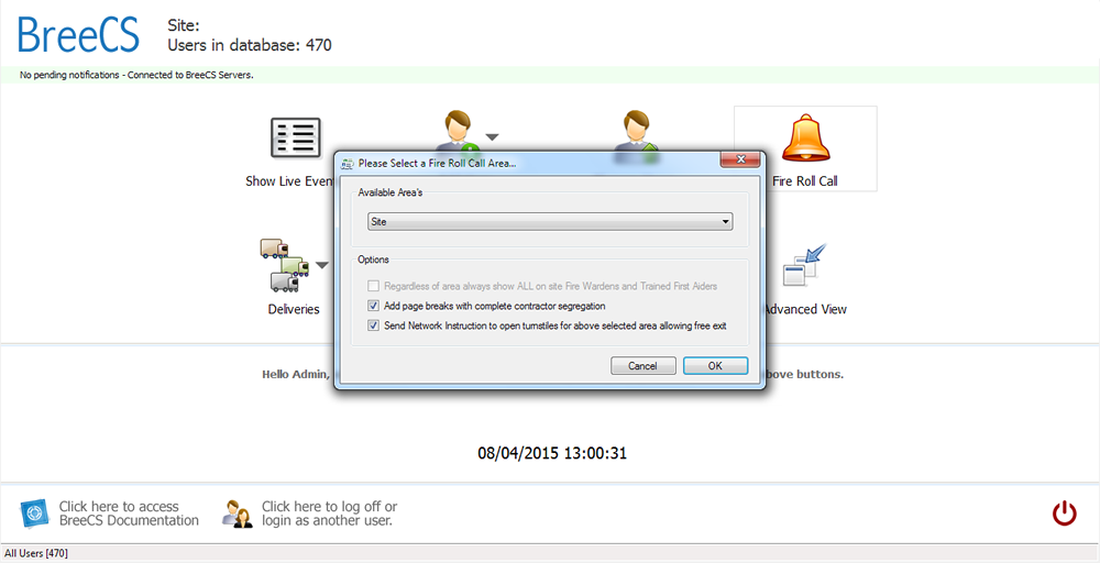 Clicking the Fire Roll Call button in either the simple or advanced view gives you a dialog from which you can select various options. You can generate a report for the entire site or just a specific area, add optional page breaking and complete contractor segregation and the ability to send network instructions to all connected ACU's / turnstiles to put them in "free spin".