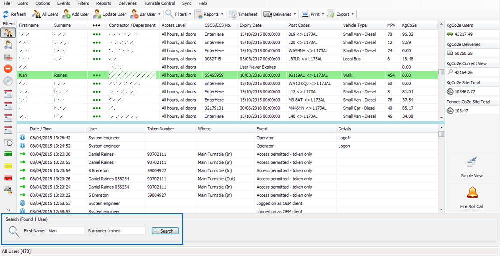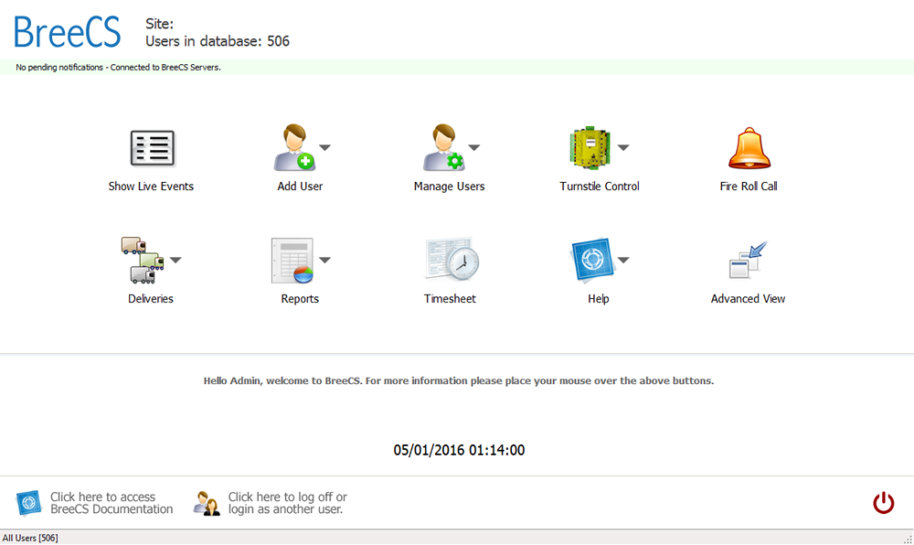 BreeCS offers two view modes, this is the simple view where the end user can access all of the main features but with a clean, minimal interface. When you hover your mouse over any button you are presented with a short description informing you what will happen when clicked. This mode also shows the site name, how many users are currently stored within the database and date/time information.