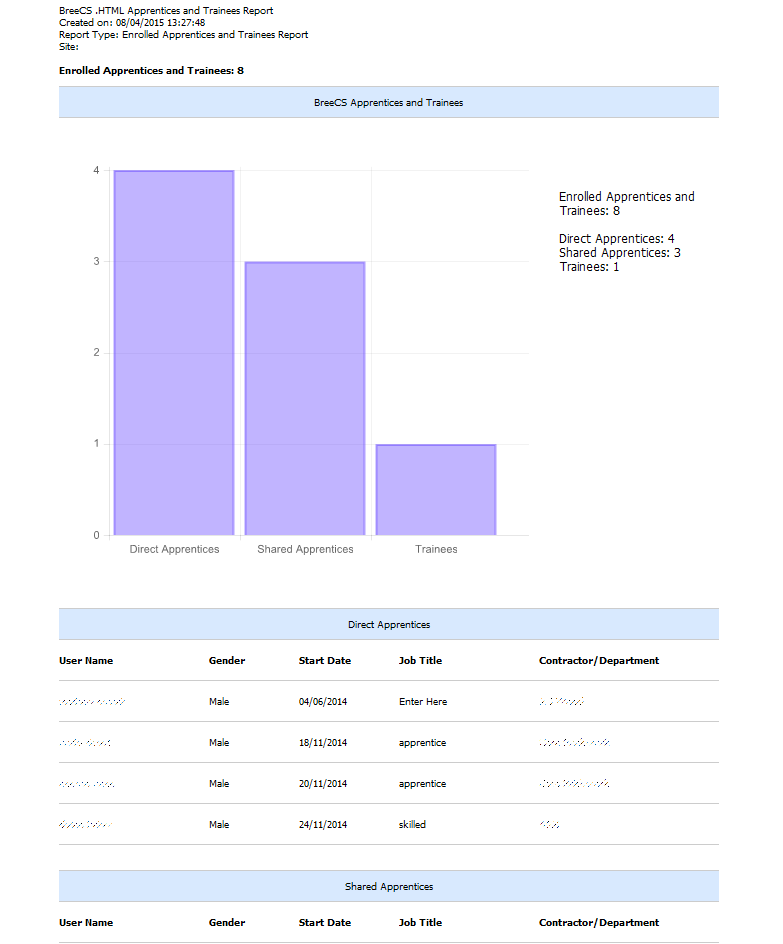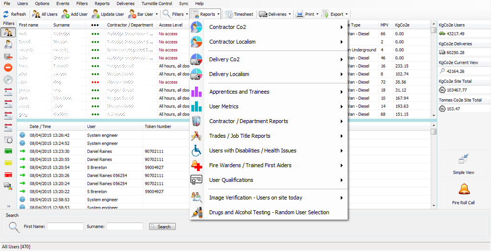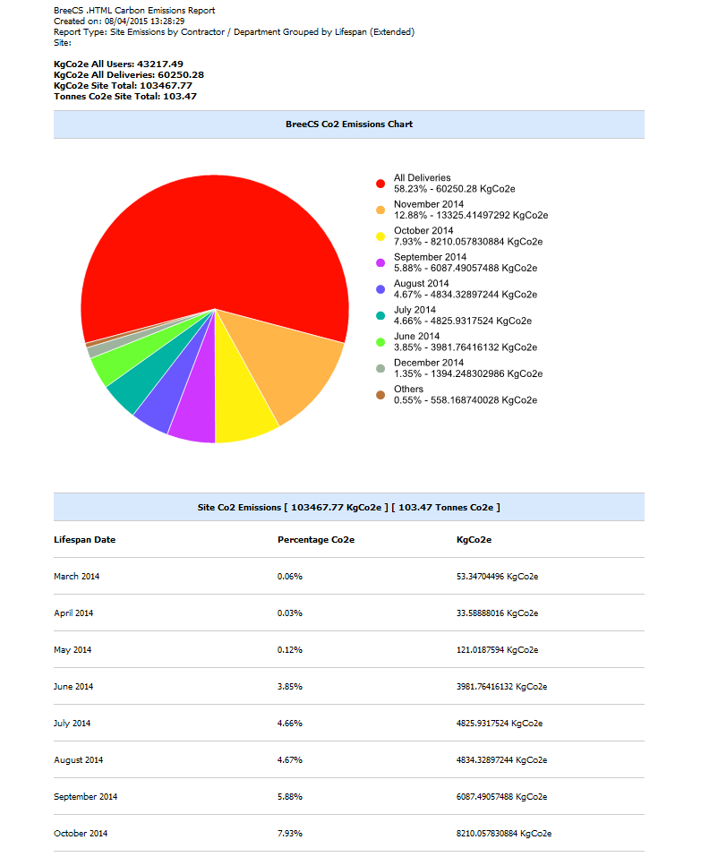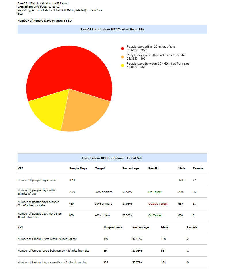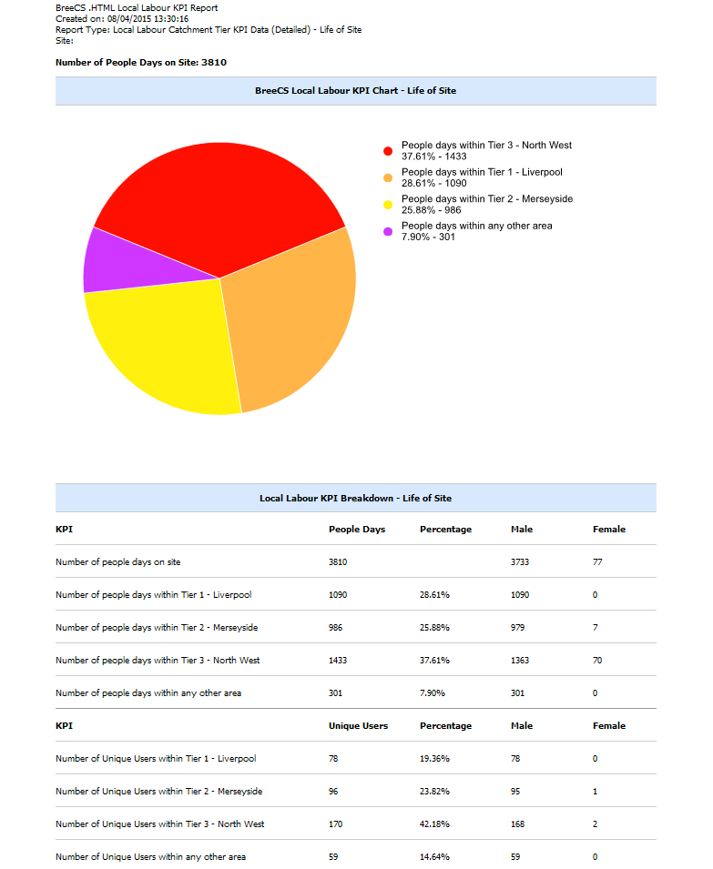 BreeCS has a vast array of reports available: Co2 for contractors and deliveries (By Contractor and Delivery, by Lifespan and by Postcode Catchment Tier Lifespan), Local Labour and Local Deliveries (2 Tier, 3 Tier and Postcode Catchment Tier reporting), Apprentices and Trainees (Enrolled, on site today and select a month), User Metrics (a comprehensive breakdown including gender, ethnicity, CSCS card type...), Image Verification and Drugs and Alcohol Testing. Please see below for some example reports.