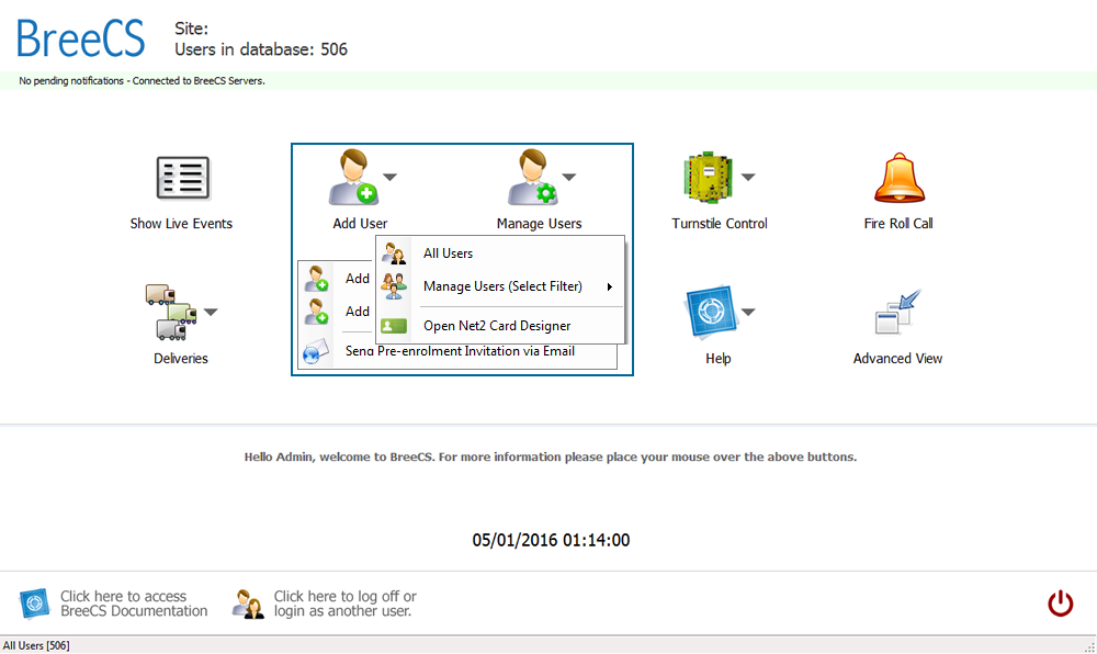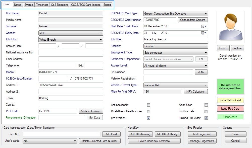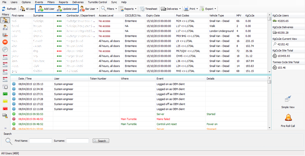 You can add a new user by clicking on the "Add User" button which will open a new window and allow you to populate this users details. Updating an existing user can be done by either double clicking their entry within the list or by single clicking and selecting the "Update User" button, this will also open a new window allowing you to update this users details. You can add new or edit existing notes, view access events, view timesheet entries, view Co2 emissions, view CSCS card images and finally export some or all of their data.