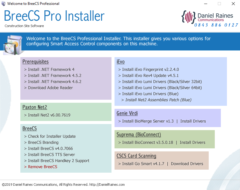 Download the BreeCS Pro installer, extract the contents of the zip file and run the setup.exe file. This will now give you various options for configuring smart access control components on your target machine.
